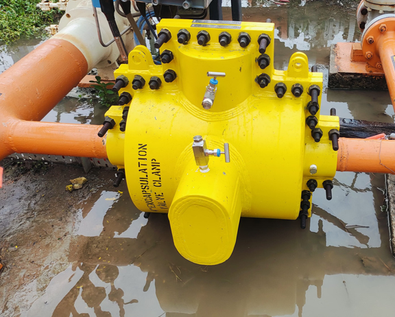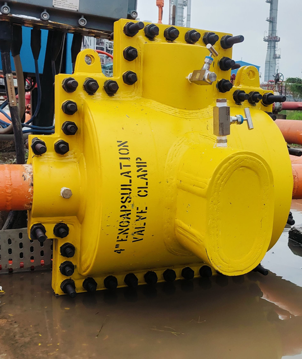 • VKVC was contacted to make an Encapsulation Clamp of the actual pipeline pressure rating and at the same time encapsulate the already installed lower rating clamp.